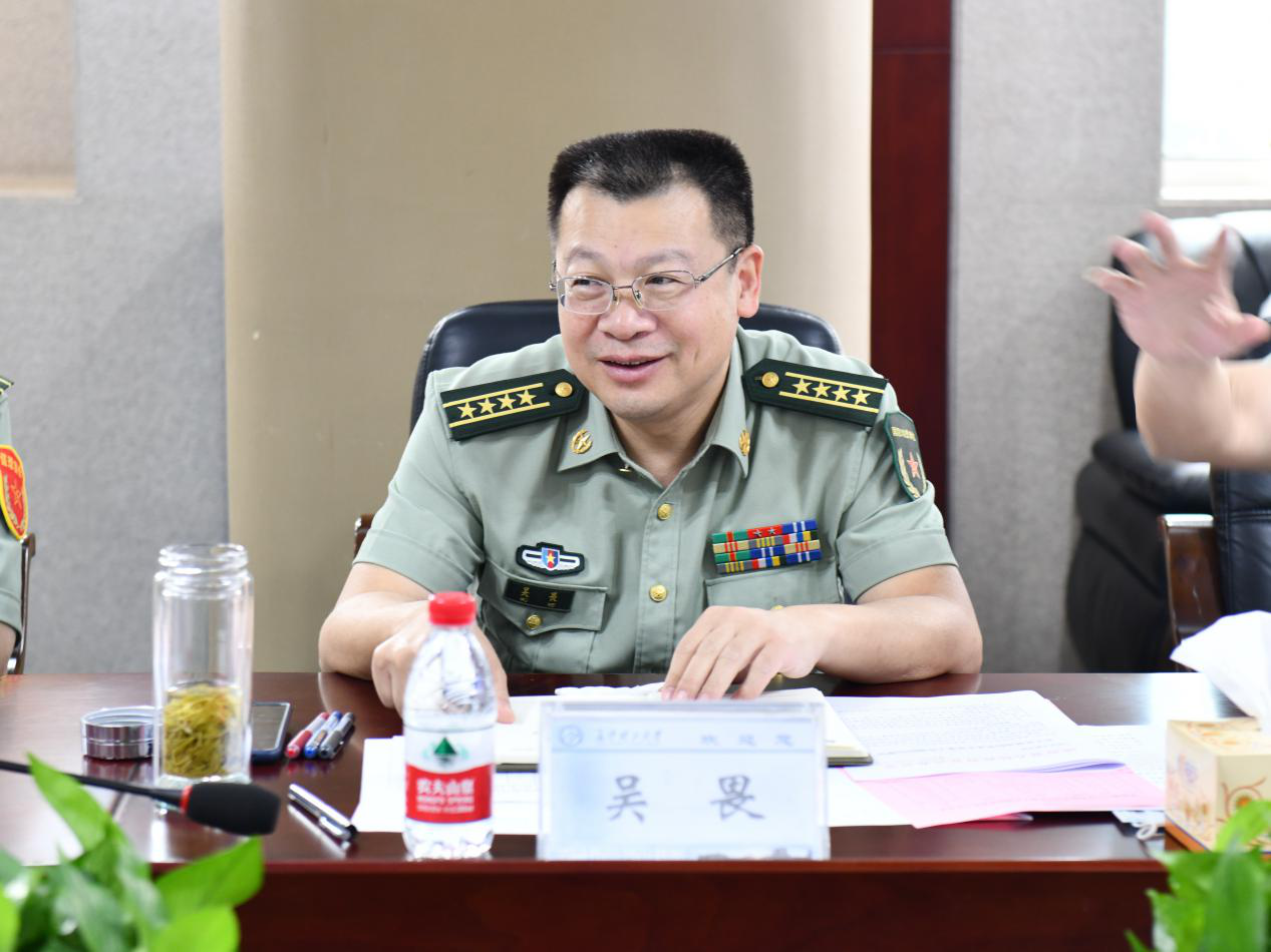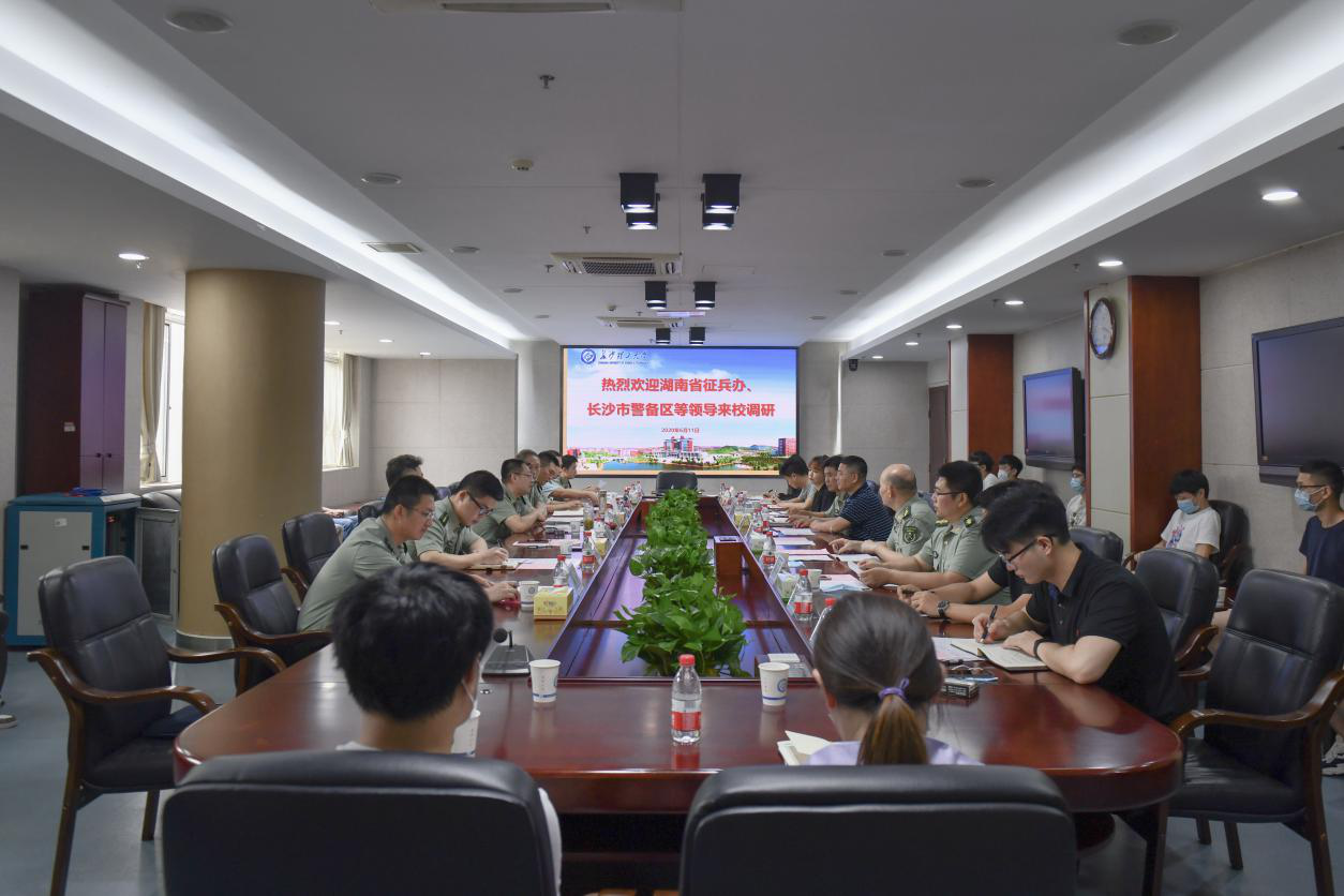 6月11日上午,省征兵办主任、省军区动员局局长吴畏、长沙市警备区司令员刘长进、天心区人武部部长周永顺等一行来我校调研征兵工作。调研会在学校一办公楼三会议室召开,校长曹一家、副校长谈传生出席会议,人民武装部、招生就业处等相关部门负责人和辅导员代表及学生代表参加了调研座谈。