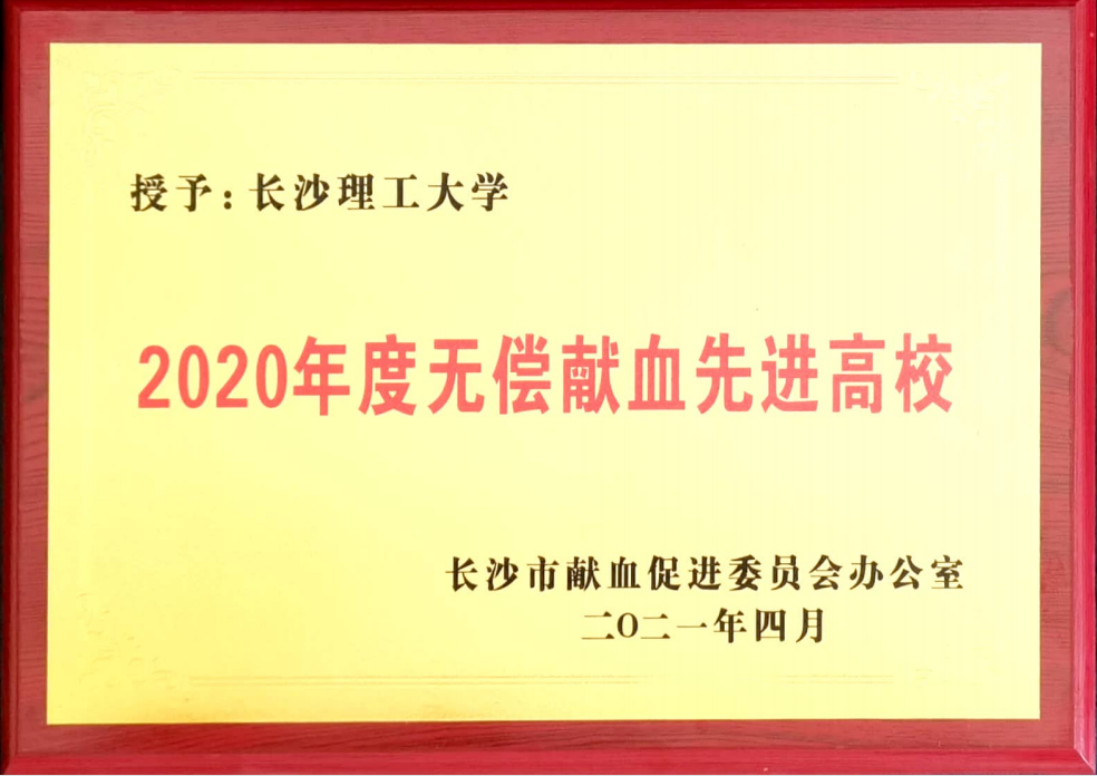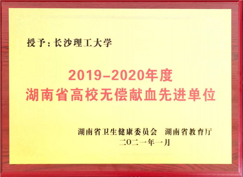 近日,驻长高等院校无偿献血表彰会议在湖南宾馆召开,我校被湖南省卫生健康委员会、湖南省教育厅评“2019-2020年度湖南省高校无偿献血先进单位”,被长沙市献血促进委员会评为“2020年度无偿献血先进高校”。