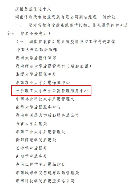 近日,在湖南省教育后勤协会组织开展的“湖南省教育后勤系统疫情防控工作先进集体和先进个人”评选中,我校公寓中心荣获“湖南省教育后勤系统疫情防控工作先进集体”。