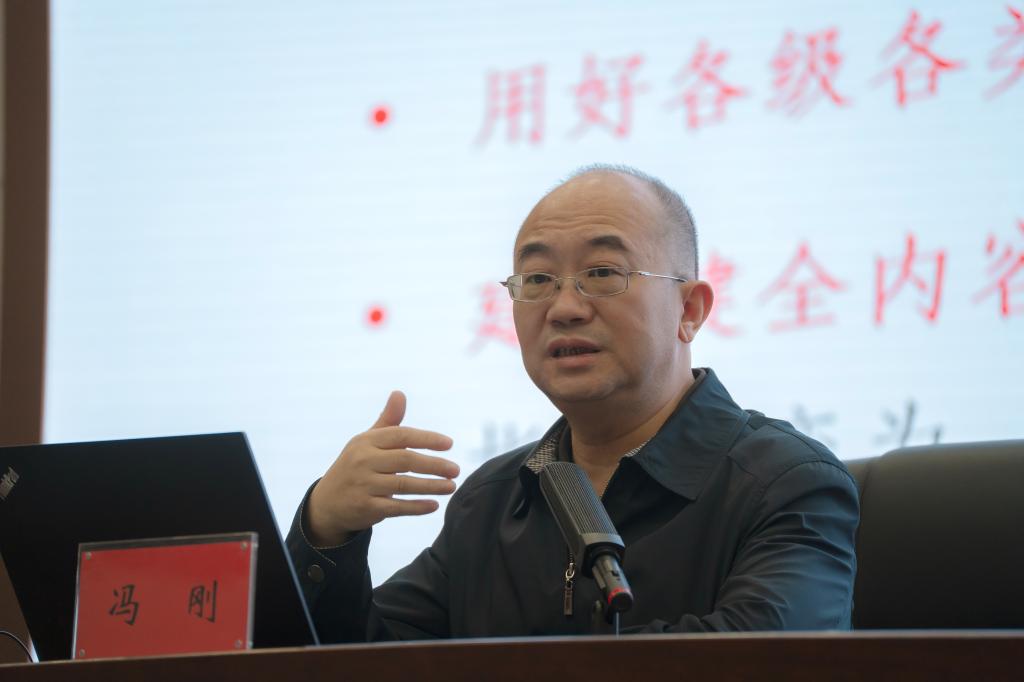 冯刚教授以“以百年党史丰厚底蕴,引领思想政治工作高质量发展”为主题,紧密围绕党的十九届六中全会精神和习近平总书记党史学习教育系列重要讲话精神,从深刻领会和把握党的十九届六中全会公报内容、中国共产党思想政治工作百年发展的规律性认识、新时代思想政治工作高质量发展、重点内容和守正创新发展五个方面全面、详实地进行了解读。