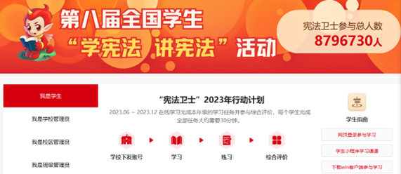 2、认真组织。各学院务必高度重视此项活动,并切实做好部署和安排。对此项工作要抓细抓实,确定一名院领导分管此项工作,学院负责学生日常管理工作辅导员具体负责工作落实,具体负责的辅导员要按要求登陆教育部全国青少年普法网(http://qspfw.moe.gov.cn),负责学院学生组织和系统班主任角色的管理工作。各学院可通过主题班会的形式统一组织学习与评价,确保人人参与,参与率达到100%(2023级新生待学生报到后另行通知)。各学院参与学习情况将作为学工系统年终日常考评的重要依据。