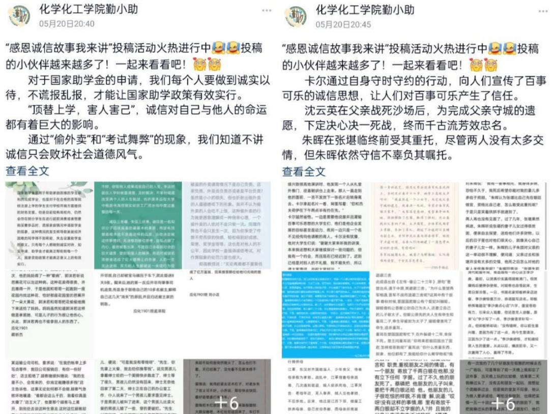 为了鼓励学生养成良好的感恩诚信道德品质,争做新时代文明青年人,化学化工学院特在感恩诚信月期间开展“感恩于心,诚信于行”资助育人系列活动之感恩诚信故事我来讲活动。全院同学积极参与,主动讲解亲身经历的感恩诚信故事与体会,截止目前全院已经有200余名同学进行了分享。