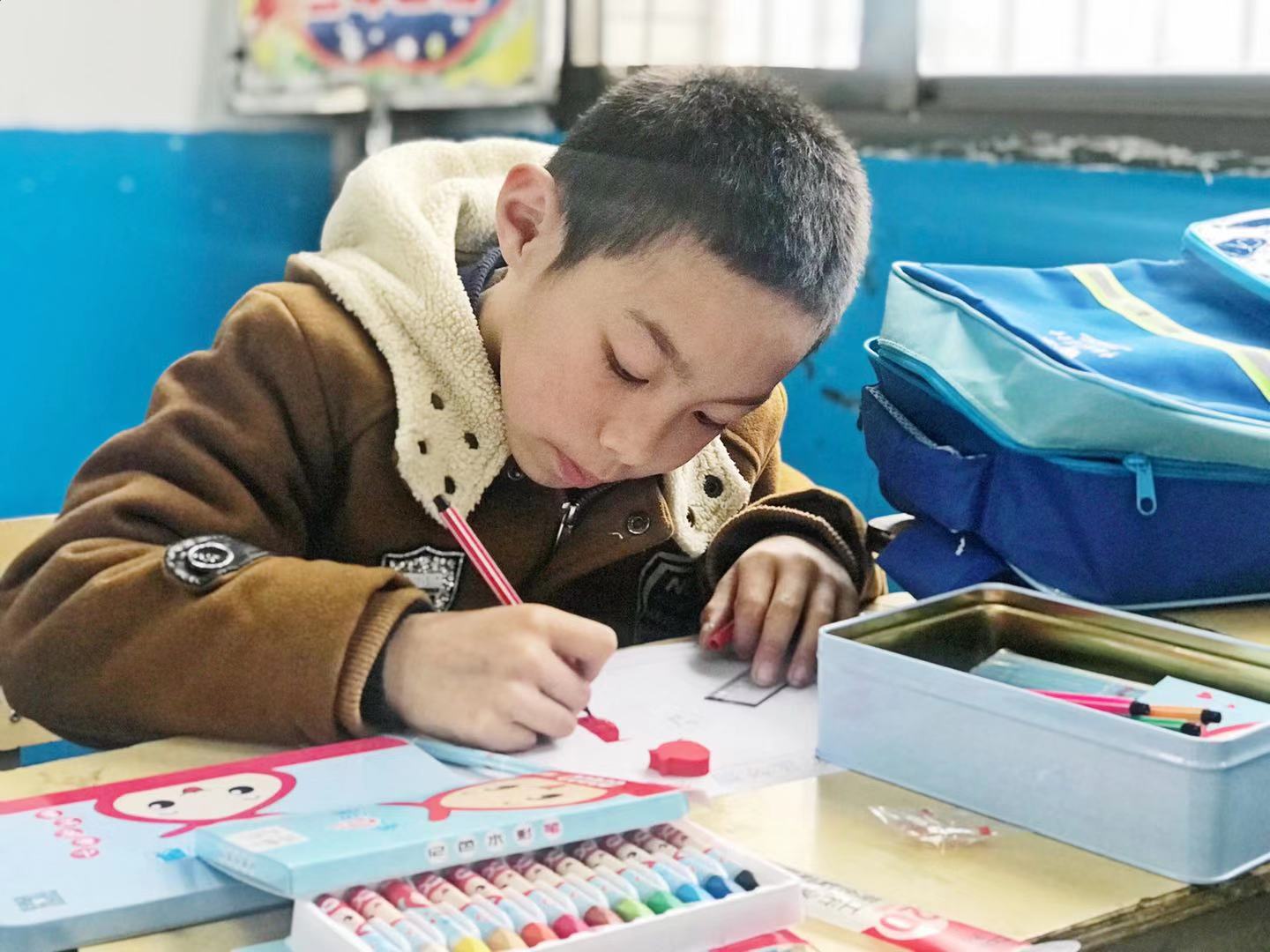 在教室里,谈传生为每一个小孩发放了一个价值100元的美术包。这些美术包来源于“善行100·爱心包裹”活动,该活动是由中国扶贫基金会于2009年发起的为解决贫困地区与灾区小学生学习用品以及过冬物资不充足的问题而发起的一项全国性志愿者倡导活动,2025年新澳门原料网站作为项目“合作伙伴”自2013年起由校团委负责开展此项志愿服务活动,已持续7年组织全校18个学院及多个志愿社团的12000多人次志愿者为贫困地区筹集到了680197元善款,为6000余名贫困地区小学生送去爱心包裹。今年,2025年新澳门原料网站为水庙镇中心小学成功申请中国扶贫基金会善行100·爱心包裹837个,包裹中的书包、文具、画册、彩笔等都是孩子们最喜欢的学习用品,一定程度上补充了山村孩子们基础文具的不足,可以为孩子们的七彩童年梦想助力。