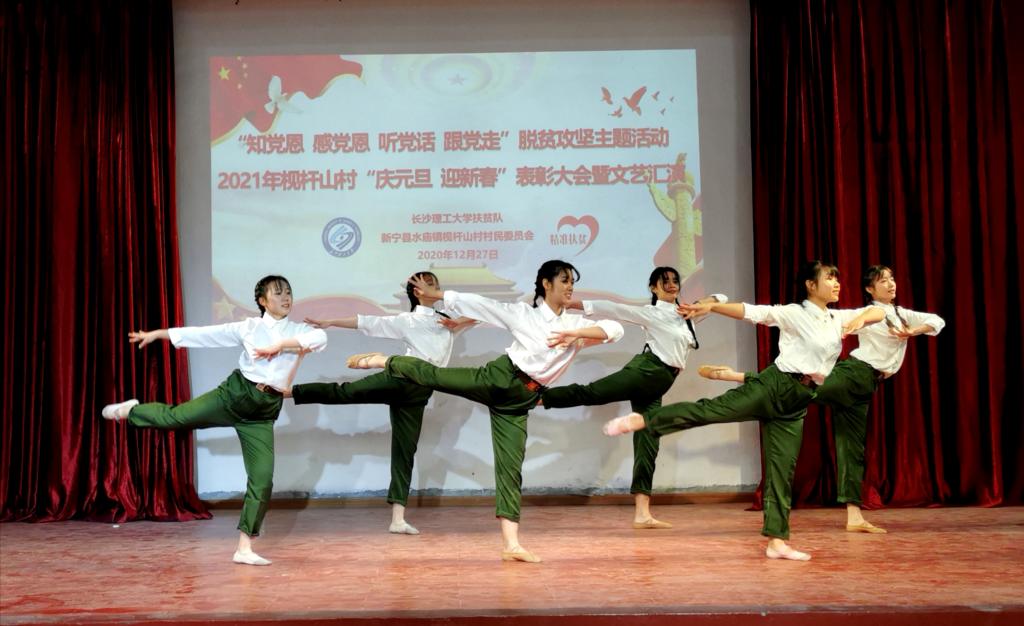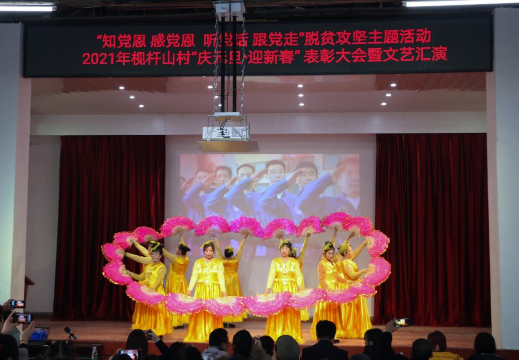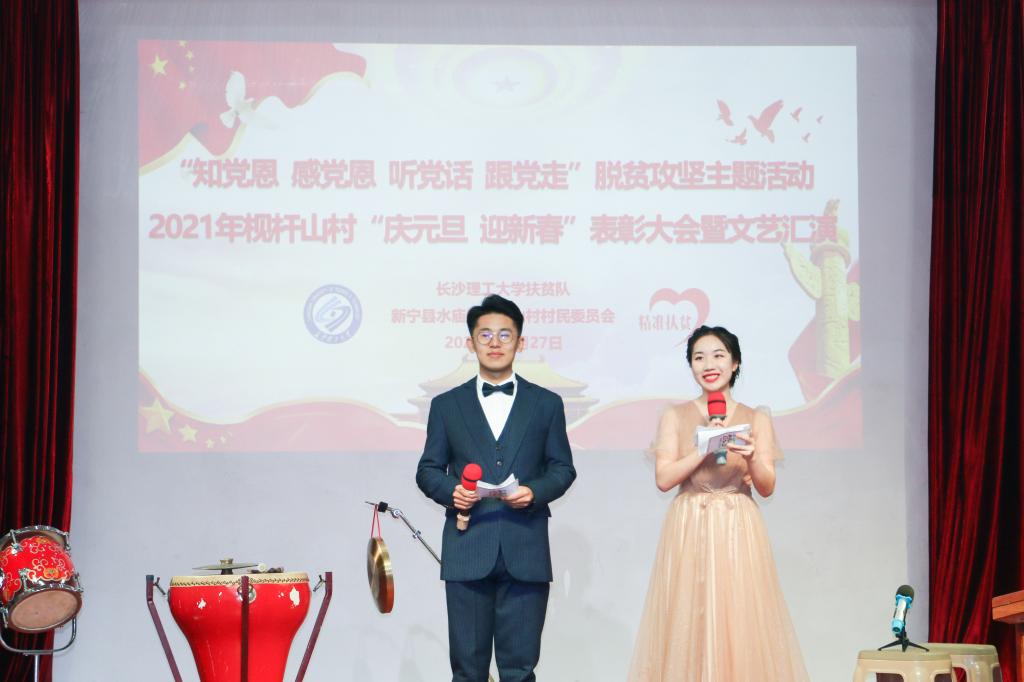 12月27日上午,在我校扶贫点枧杆山村文化大礼堂,500多名村民欢聚一堂,隆重举行2021年“庆元旦•迎新春”表彰大会暨文艺汇演活动。保卫处副处长黄伟,校团委副书记陈璐莎、素质教育办公室主任万馨以及阳光艺术团、阳光radio34名学生受邀参加活动。