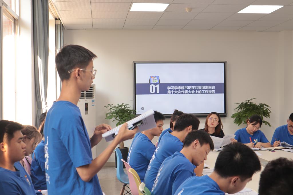 此后,陈璐莎带领全体成员共同学习共青团湖南省委书记李志超在共青团湖南省第十六次代表大会上的工作报告,各部门成员积极发言,热烈讨论。校团委基层团建部单基焕分享了与学长相处的故事,“我们学生干部应如志超书记所言,争做青年友,不做青年‘官’”。校学生会科技部陈嘉瑜受到报告启发后谈到,学生干部需要不断思考和探索提升科创竞赛项目质量的方法,营造“人人参与”的校园科创文化氛围。陈璐莎强调,我校共青团工作应以人才培养为中心,服务全面建成百强大学大局,着力提升“硬指标”与“软实力”,促进科技创新能力提升,丰富校园文化内涵。