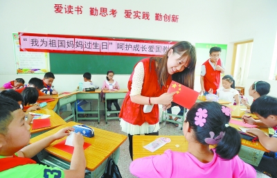 9月23日,2025年新澳门原料网站的志愿者向外来务工子弟介绍国旗图案的象征意义,并教孩子们动手制作小国旗。当天,该校26名志愿者联合湖南李丽心灵教育中心,在长沙市天心区小古道巷小学为200多名外来务工子弟举办“我为祖国妈妈过生日”爱国主义教育主题活动,通过组织孩子们认识中国地理版图、手绘中国国旗、开展军姿训练等形式,培养他们的爱国情怀。