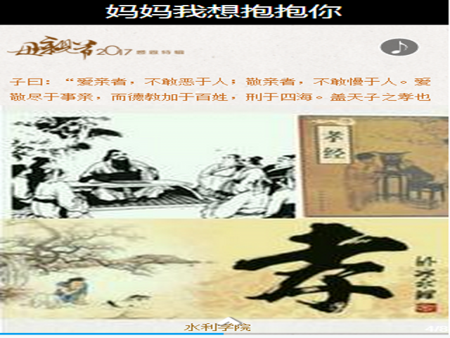 在“给母亲的一封信”中,同学们以最传统的形式表达着深藏于内心之感恩与感谢,水利学院的志愿者们也将帮有需要的同学将信寄到母亲手中,让爱传递,让心相通。与新媒体的快速传播迥异的是信件将成为两辈人共同的记忆,让爱保存着他暖心的温度。而在现场随机采中,同学们在镜头前真情流露,有的同学因为自己先前的不懂事而借此机会向母亲表达了诚恳的歉意,更多的则在这个温馨的日子里为远方的母亲送去了温暖、真切的祝福。在新媒体平台上,不仅引导同学们学习了中华传统经典《弟子规》以及《孝经》中的经典亲情名言,开启了同学深埋于心灵深处之感情。祝福墙上,“我爱你不止14号这24小时”戳中了年轻的心扉,引导同学们追忆往事,反思自我,培养学生的责任与感恩意识,让感恩不仅停留在母亲节这个特殊的日子里。