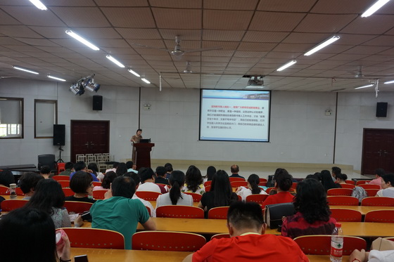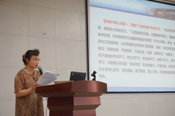 周雪婷首先阐述了坚持教书与育人相统一,需要广大教师做到以下三个方面:忠诚教育事业、提升专业水平、开启创新引擎。随后,她结合自身多年的教育教学经验,分享了对新形势下英语教学方法的五点思考。一是注重师生课堂角色的转换。从传统的以教师、教材为中心的课堂模式转换为以学生参与为主、以教师引导为辅的课堂教学新模式,充分尊重学生的主体地位,使学生成为课堂的主人。二是注重“教”“学”并重,重视能力培养,不仅要让学生“学会”,更要培养学生“会学”的能力,突出教学的双边性,使学生学习性质由传授性、继承性转变为探索性、发展性。三是重视非智力因素对学生的作用,充分、合理地运用各种非智力因素,丰富和促进教学方法的创新,特别是突出情感性,做到情理交融。四是倡导开放性教学,如把讨论、演讲、辩论、新闻发布会等开放教学引进课堂,培养学生运用所学知识去观察、分析、解决实际问题的能力,在实践中实现知、情、信、意、行的转化。五是树立文化自信和文化自觉意识,培养“一带一路”建设战略人才,引导学生树立参与国际交往的意识,讲好中国故事。