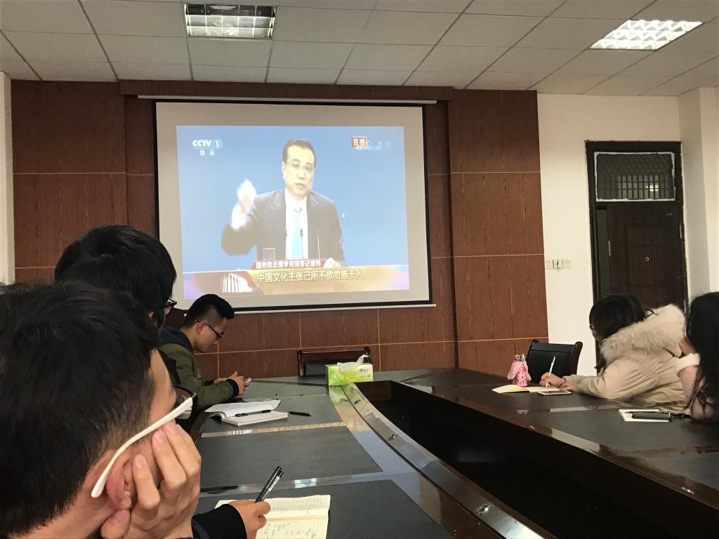 3月20日上午,中华人民共和国第十三届全国人大一次会议正式闭幕,为贯彻学习“两会”精神,提升学生党员的理论水平,党建辅导员李小军和部分学生党员集中在工科一号楼A422观看了“两会”闭幕式及总理记者会。