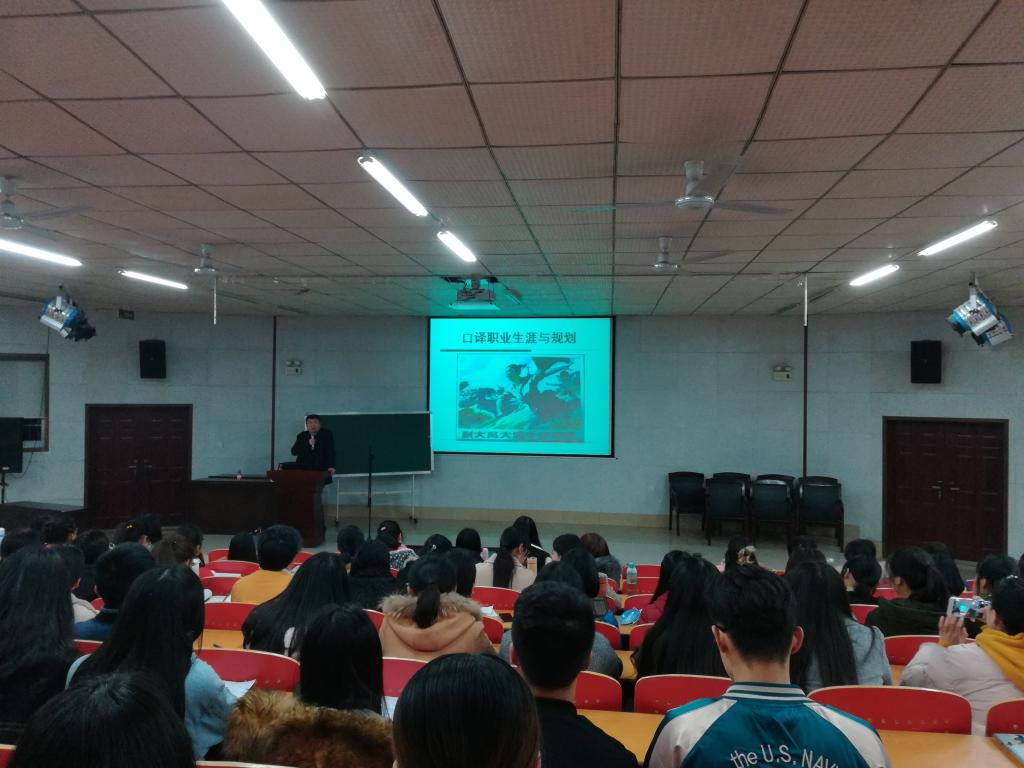 3月21日晚,中国翻译协会翻译能力培训与评估中心主任张雪涛应邀在文科楼A100为学院师生做了一场题为《口译职业生涯与规划》的讲座,讲座由外国语学院副长黄月华主持,全院近200名师生参加。