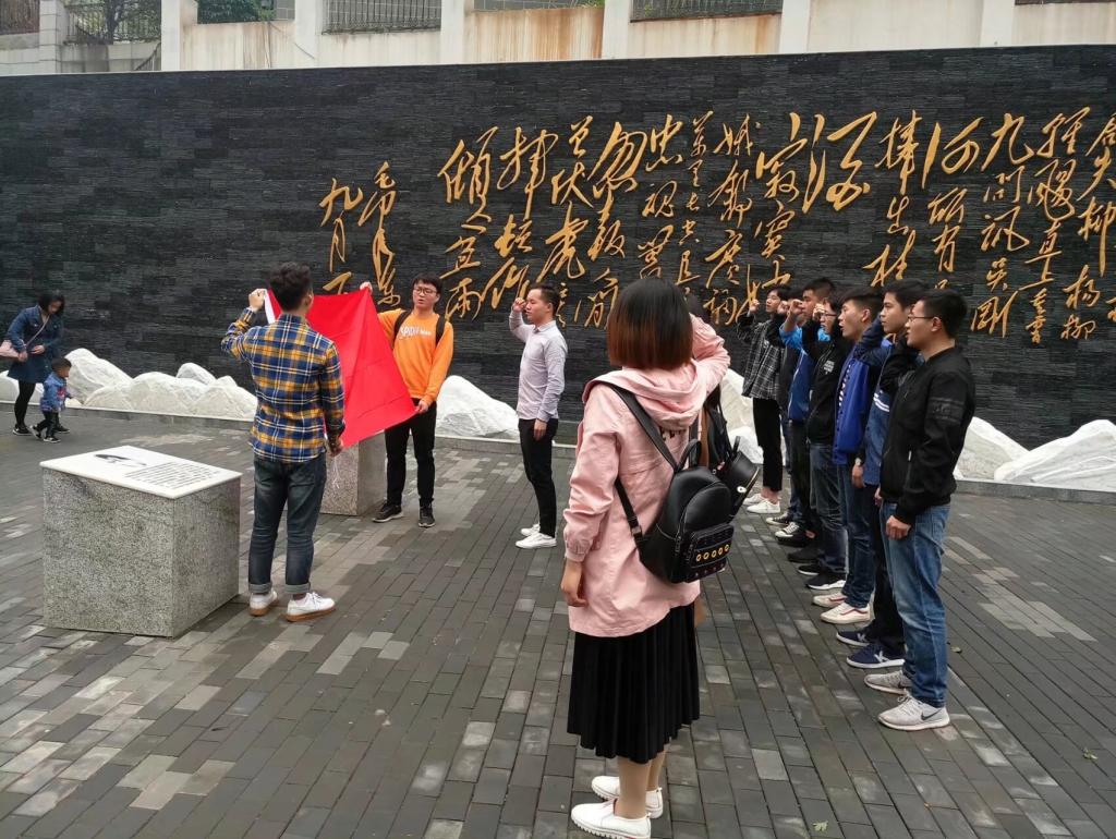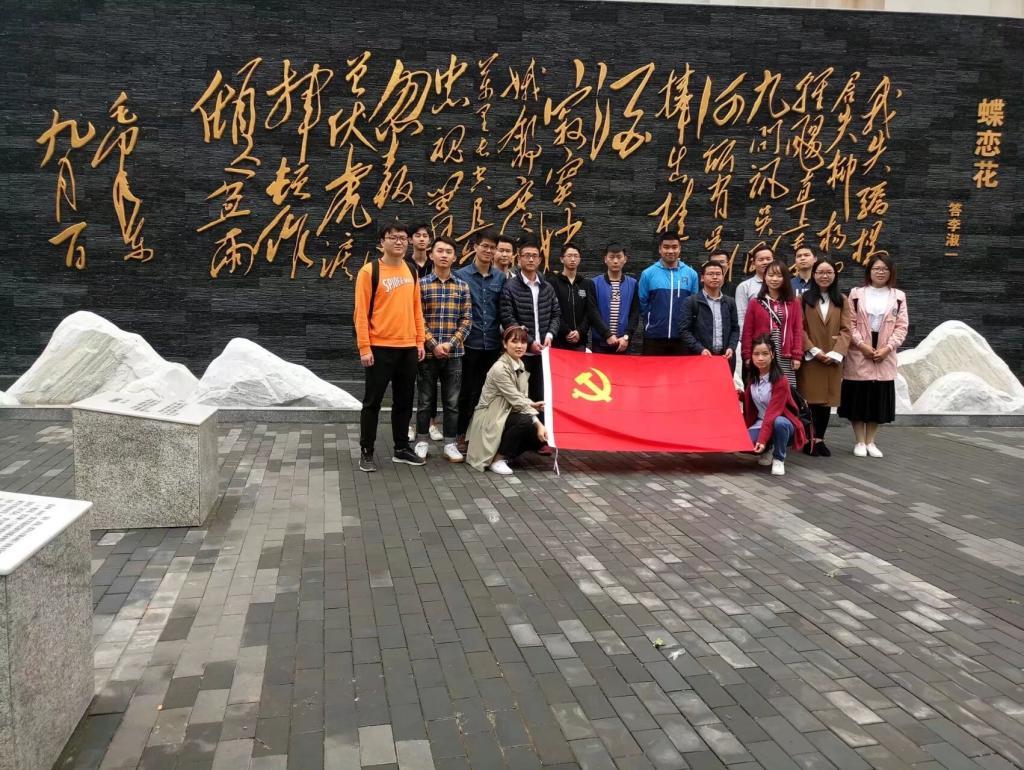 本次活动内容包括献花缅怀先烈、集体宣誓、介绍杨开慧同志生平事迹、自由活动等几个方面。纪念碑前,全体党员肃立默哀,向革命先烈表示深切的哀悼和崇高的敬意,随后,各党员手捧一支白菊花,依次将花摆放在纪念碑前,一支支白菊花寄托着他们对曾将鲜血洒在这片土地上的革命烈士无限的敬仰和不尽的怀念。在17级第二党支部书记李磊的带领下,全体党员在纪念碑前面对党旗重温了入党誓词。李磊号召研究生党员都要以这次重温入党誓词活动为新的起点,不忘初心、牢记使命,加强政治思想觉悟,严格要求自己,乐于担当,敢于担当,发挥党的先锋模范带头作用。随后,李磊就杨开慧的生平事迹以及壁上那首《蝶恋花答李淑一》进行了简单的介绍。最后,研究生党员们参观了开慧广场并拍照留念。