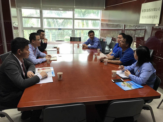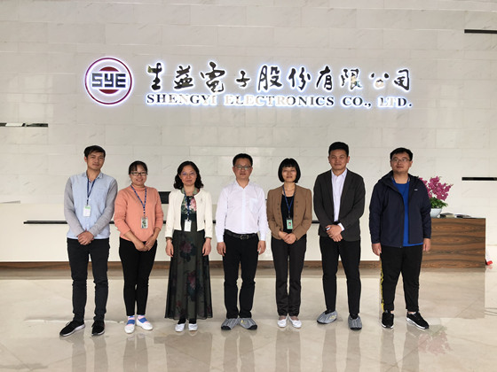 在广东生益电子股份有限公司,公司行政总监潘森女士首先对学校走访企业表示热烈欢迎,并充分肯定了往届学校毕业生在公司的表现情况。公司今年已签约2018届毕业生10人,其中6人来自化学学院,这些毕业生综合素质优异,非常符合公司的用人需求;汪功伟从学校学生情况、专业设置、人才培养以及学院详细情况等方面向公司做了介绍,并就就业基地建设、企业奖学金设立、学生实习等问题与公司进行了深入交流;最后,在公司人事部门负责人的陪同下,参观了公司办公区域及生产一线,深入了解毕业生工作实际情况。
