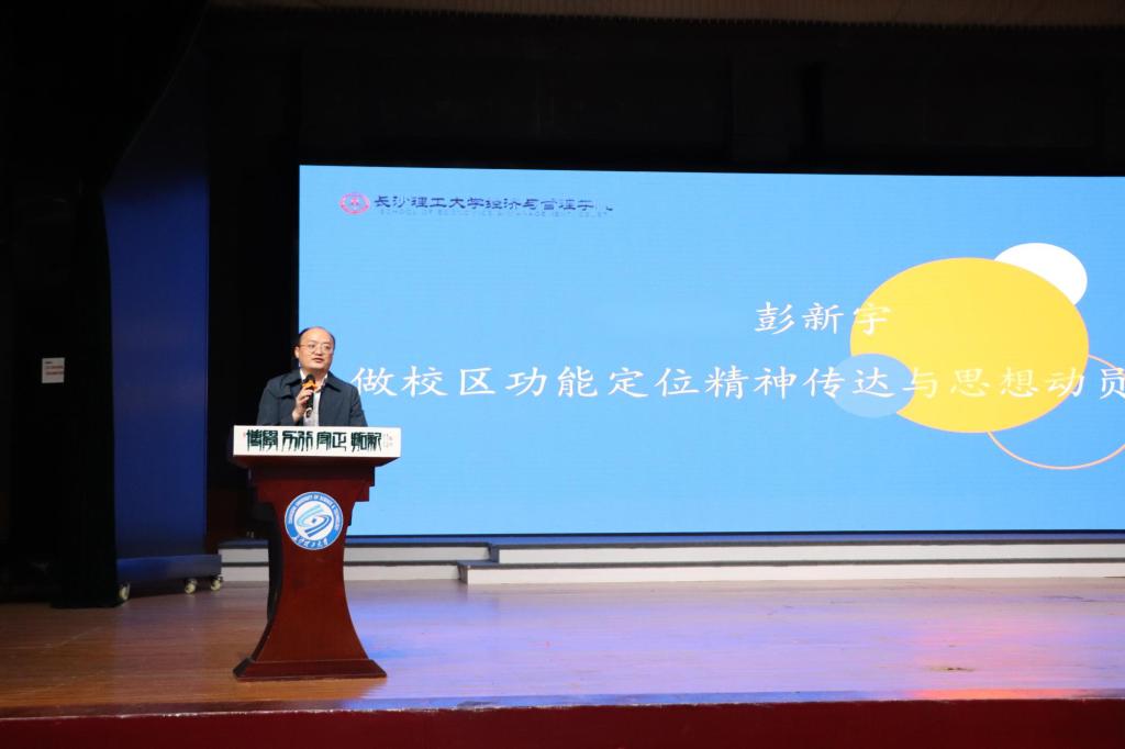 彭新宇向各年级宣布学校校区功能定位决定,从学院搬迁规划、资源整合等方面着手,表示与会学生要服从学校决策,执行学校决议,更好规划未来。