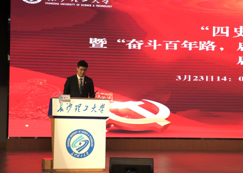 学生代表、交通学院刘张锐在发言中倡议广大同学利用今年主题教育的机会,在原著中、思考中、实践中深入学“四史”,在新的征程中扬帆启航。