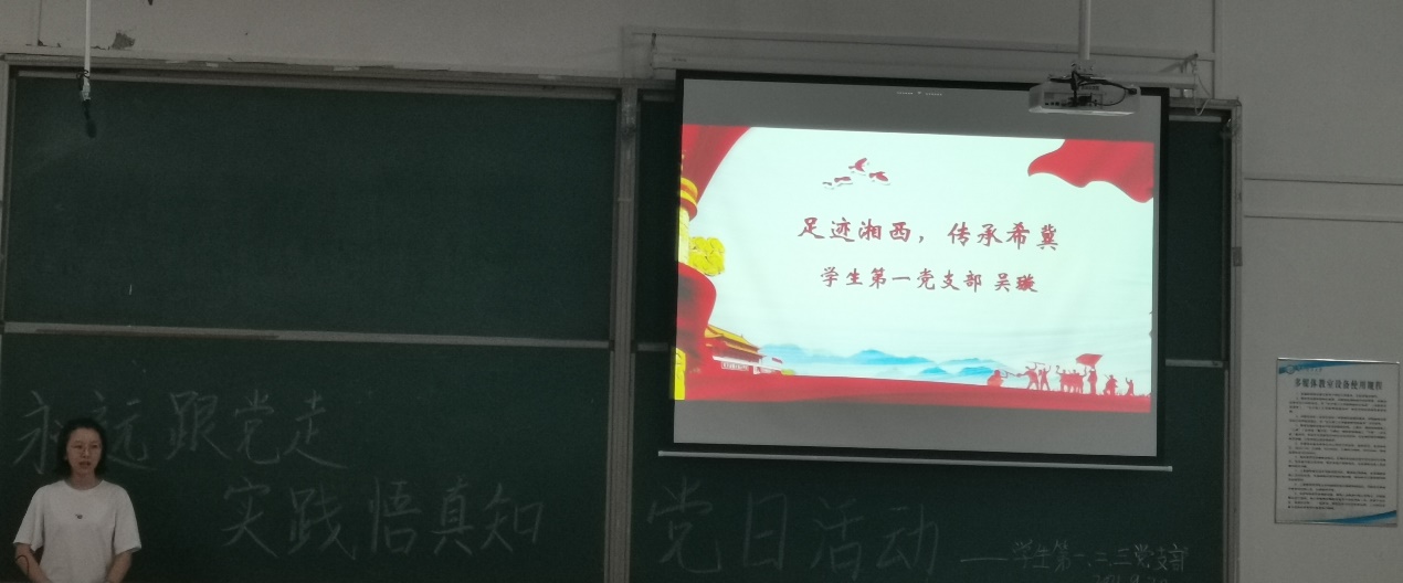 “足迹湘西,传承希冀”这是吴璇与大家分享的主题。吴璇介绍了她在暑假期间去往湘西支教的过程与感悟,她提到支教期间生活虽然简单且艰苦,但是每一天都过得十分充实。团队的团结一致,努力克服各种困难是她支教期间最大的感触。最后她还呼吁所有党员同志积极参与社会实践,以此来体验生活,帮助他人。