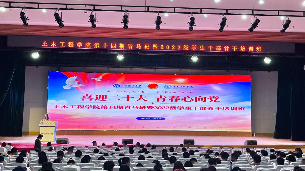 为贯彻落实全国教育大会精神,进一步加强学生工作队伍建设,提高工作能力和水平,10月3日,土木工程学院在金盆岭校区五教大礼堂举办第十四期青马班暨2022级学生干部骨干培训班。学生工作办公室主任李小军老师及文明养成与学风督导负责人戈畅主讲。2022级年级组全体成员、全体班委和院学生会干事、寝室长参加培训。2022级辅导员林安妮老师主持会议。