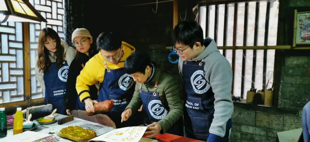 揭牌仪式前,尹冬香介绍滩头年画是湖南省邵阳市隆回滩头镇极具特色的汉族民间工艺品,是汉族特有的一种绘画体裁,也是中国农村老百姓喜闻乐见的艺术形式。近年来,滩头木版年画创新中心在继承传统滩头年画工艺的基础上不断进行创新,致力于丰富滩头年画的表现形式和精神内涵,制作拥有更高艺术价值的精品力作,形成品牌效应,提高滩头年画的知名度和品牌价值。工艺美术系主任王清鼓励各位参与实践的同学们,要学会在实践中感受传统工艺的魅力,在传统工艺的基础上融入现代设计思维,大胆进行创新,让滩头年画成为更多人喜闻乐见的艺术表达形式。最后,尹冬香在致辞中提到,滩头是“现代民间年画之乡”,滩头木版年画也经常作为民间代表性工艺品参加国内外各种展览活动,她也曾作为代表前往澳门、尼泊尔等地参加展览活动。其中,滩头年画作品《吉娃送福》参加第六届中国成都国际非物质文化遗产节、《老鼠娶亲》参加首届中国•开封朱仙镇年文化节。弘扬非遗文化,保护滩头年画,让优秀传统文化得以更好的发展,滩头欢迎各位高校师生的加入,协同创新,为滩头年画的创新发展贡献一份力量。