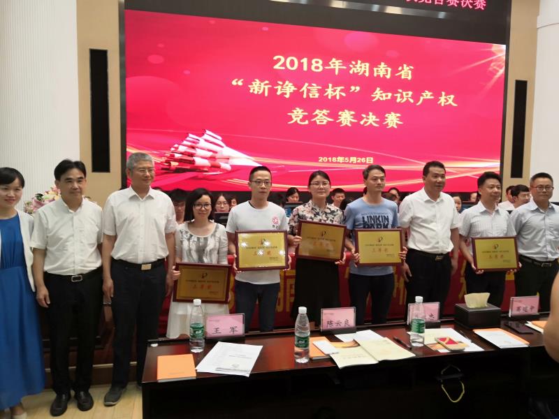 5月26日上午,由湖南省教育厅和湖南省知识产权局联合举办,湖南省知识产权维权援助中心、中南大学法学院、动力惠知识产权运营平台和湖南新诤信知识产权服务有限公司联合承办的2018年湖南省“新诤信杯”知识产权竞答赛决赛在长沙市高新区管委会305国际报告厅举行。湖南省知识产权局党组书记、局长段志雄,湖南省教育厅党组成员、副厅长葛建中等领导亲临比赛现场并给获奖团队颁奖。