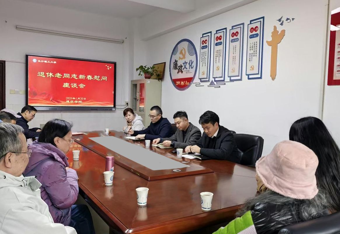 1月30日下午,建筑学院在金盆岭小区十六教305会议室举行退休老同志新春慰问座谈会。学院党委书记熊鹰、常务副院长许建和、党委副书记肖义慧、党政办公室主任杨文武与多位退休老同志欢聚一堂,共叙情谊、共谋发展。