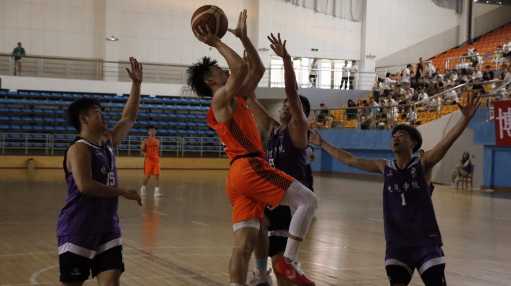 随后,电气学院与土木学院的篮男决赛现场精彩纷呈。裁判员把球高高抛起,双方前锋运动员纵深一跃,展开了激烈的争夺,气氛立刻紧张起来。两个学院代表队实力相当,电气学院与土木学院在第一、二、三节比赛结束后比分依次是9:11、23:24、36:38,比分咬的很是紧,形成你追我赶的情势。在白热焦灼的局面,双方队伍多次叫停休息以缓解比赛选手的疲劳,又以换球员方式来调整团队比赛策略。最终,土木学院3号选手经过半场后,稳稳地接过队员传球,一个疾步转身绕过防守队员,又以挽弓后仰之势跳投,篮球弧线宛若弯月,“唰”的一声进球,这鼓舞了整个团队的气势。土木学院凭借此时的精神头撕开了对手的防守底线,最后以59:47斩获冠军。