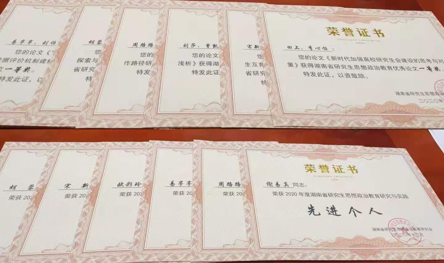 在本次年会上,我校获评“2020年湖南省研究生思想政治教育研究与实践先进集体”,经管学院辅导员周路路等六名老师被评为“2020年湖南省研究生思想政治教育研究与实践先进个人”。同时年会上还评选了研究生思政研究优秀论文,我校共有6篇文章获评优秀论文,其中一等奖2篇,二等奖1篇,优秀奖3篇。