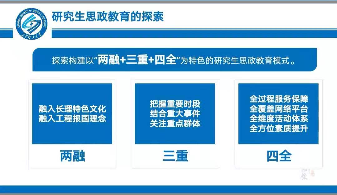 2020年以来,校研究生院(党委研究生工作部)在学校党委的坚强领导下,深入学习贯彻全国研究生教育会议精神,落实“立德为本,夯基为根,刚柔并济,特色致远”的工作理念,坚持以“服务研究生发展,服务双一流建设”为宗旨,以“提升学术贡献率,增强认同感、归属感、自豪感,培养具有较强科研能力、鲜明长理特质的研究生”为目标,探索构建了以“两融+三重+四全”为特色的研究生思政教育模式,思想引领坚强有力,工作体系持续完善,服务水平显著提升,先进典型不断涌现,工作成效得到了广泛的认可。(文/张茂华 图/谢易真 审/田上)