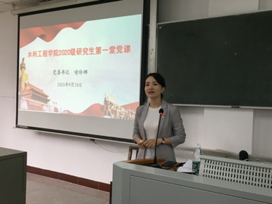 水利工程学院党委书记喻玲娜的“第一堂党课”以“最美的青春”为主题,她从“付出决定未来”、“眼界决定境界”、“自律决定人生”和“‘赢’的解剖”四个方面展开讲述,结合新冠肺炎疫情防控的生动案例,强调新时代是一个英雄辈出的时代,青年人正逢其时,勉励研究生党员不负青春、不负韶华、不负时代。她寄语2020级新生,用读书积蓄力量,用行动肩负责任,用拼搏昭示理想;牢固树立自律意识,不断拼搏,创造自己“最美的青春”。