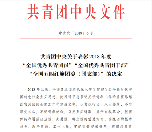 近日,《共青团中央关于表彰2018年度“全国优秀共青团员”“全国优秀共青团干部”“全国五四红旗团委 ( 团支部)”的决定》(中青发【2019】6号)文件正式下发,我校土木工程学院2018级硕士研究生杨琪毅同学荣获 “全国优秀共青团员”荣誉称号。