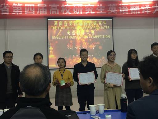 11月11日晚,由湖南省人民政府学位委员会办公室主办的湖南省第四届高校研究生英语翻译大赛在南华大学落下帷幕。此次大赛有来自18所高校的近150名选手参赛。我校研究生英语笔译专业温迎迎同学以总分排名第八的成绩获得笔译三等奖;英语笔译专业钟宇宸同学总分进入前十五获得口译优胜奖。