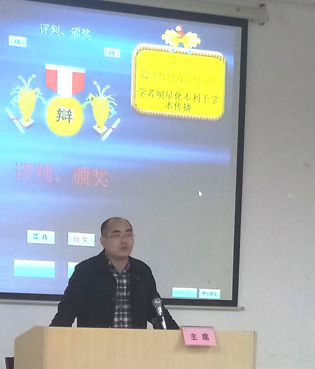 第二个辩题“学者明星化有利于/不利于学术传播”的辩论现场,同样高潮迭起精彩非凡,对于反方汽机学院提出的“学者明星化会影响学术传播”,电气学院作为正方辩手回道:“学者明星更有利于对于大众的学术传播,通俗的传播方式更有利于学术繁荣”,而反方三辩则四两拔千斤,以易中天实例巧妙的进行了回击。