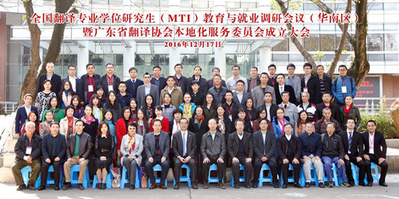 2016年12月16-17日,全国翻译专业学位研究生(MTI)教育与就业调研会议(华南区)暨广东省翻译协会本地化服务委员会成立大会于广东外语外贸大学召开。会议由全国翻译专业学位研究生(MTI)教育指导委员会、广东外语外贸大学、广东省翻译协会、广州翻译协会主办,广东外语外贸大学高级翻译学院和广东外语外贸大学外语研究与语言服务协同创新中心承办。来自全国20多所高校和相关企业的代表150余人参加了本次会议。我校研究生院副院长蒋菲及外语学院武俊辉博士应邀参加本次大会。