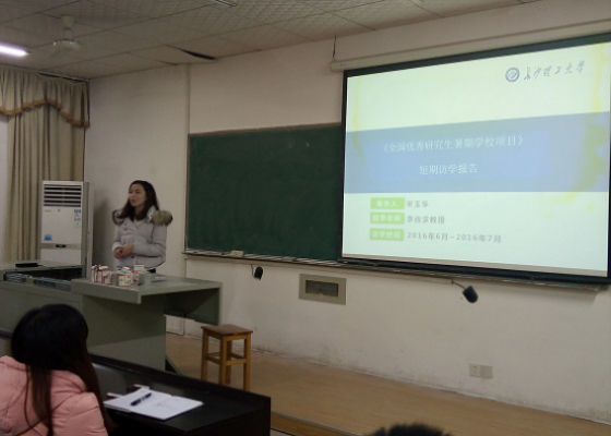交流会中,宋玉华主要与大家分享了她在研究生国(境)外短期访学的申请过程和学习生活经历。她主要从境外交流项目、项目申请过程、国外学习、在法生活等方面进行介绍。首先,宋玉华就境外交流项目的背景、交流时间、访学主题与特色、经费资助情况为大家做了一个简单说明。随后,还与大家介绍了雷恩一大不同课程之间的区别。接着,宋玉华通过她自己拍摄的照片与大家分享了她在法国雷恩一大的学习和生活情况。在这个过程中,她和大家分享了自己在法国的生活心得,重点讲到自己对学术的新认识,对国外生活的感触。最后,宋玉华对大家申请出国提出了建议,并鼓励同学们积极申请出国留学或者访学机会,要有一颗敢于尝试的心。