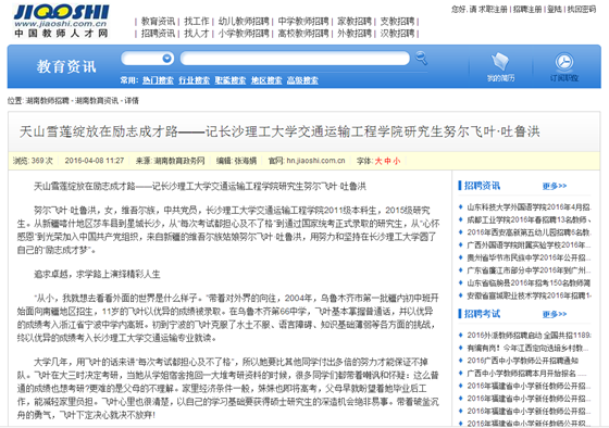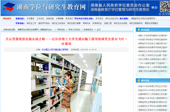 近日,我校交通运输工程学院2015级研究生努尔飞叶·吐鲁洪同学被评为《中国研究生》杂志封面人物(2016年第8期),其优秀事迹也刊登在同期杂志上。
