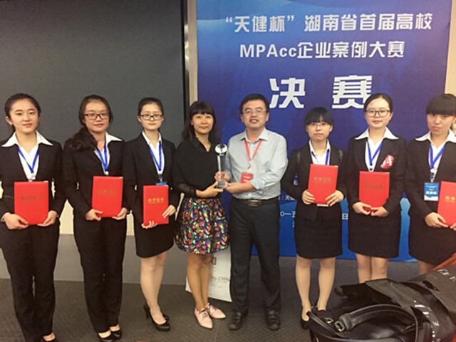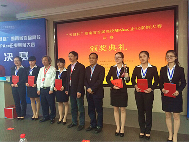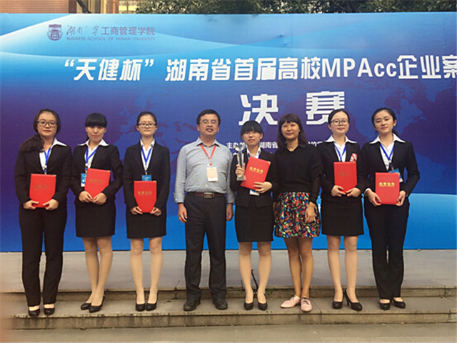 2015年10月24日,“天健杯”湖南省首届高校MPAcc案例大赛决赛在湖南大学工商管理学院报告厅成功举办。本次大赛由湖南省人民政府学位委员会办公室主办,湖南大学承办。我校经济与管理学院财务与会计系主任兼MPAcc项目办主任王治副教授、指导教师廖小菲副教授带队参加了决赛。从24支省内各高校队伍中脱颖而出的10支决赛队伍进行了激烈角逐,通过文本分析、PPT现场竞演等方式将纷繁复杂的商战例子进行深入浅出的完美展示。我校入围决赛的“群英汇”团队奋力拼搏,最终取得了全省二等奖的好成绩。