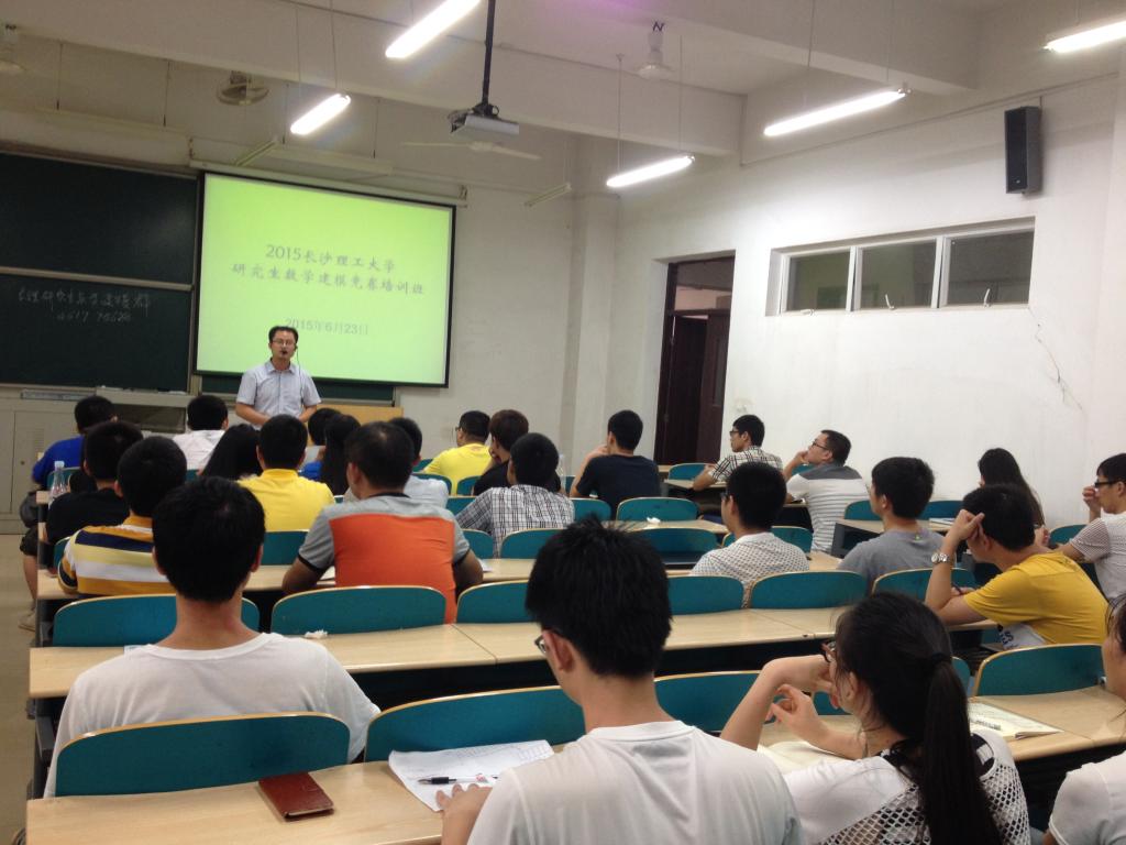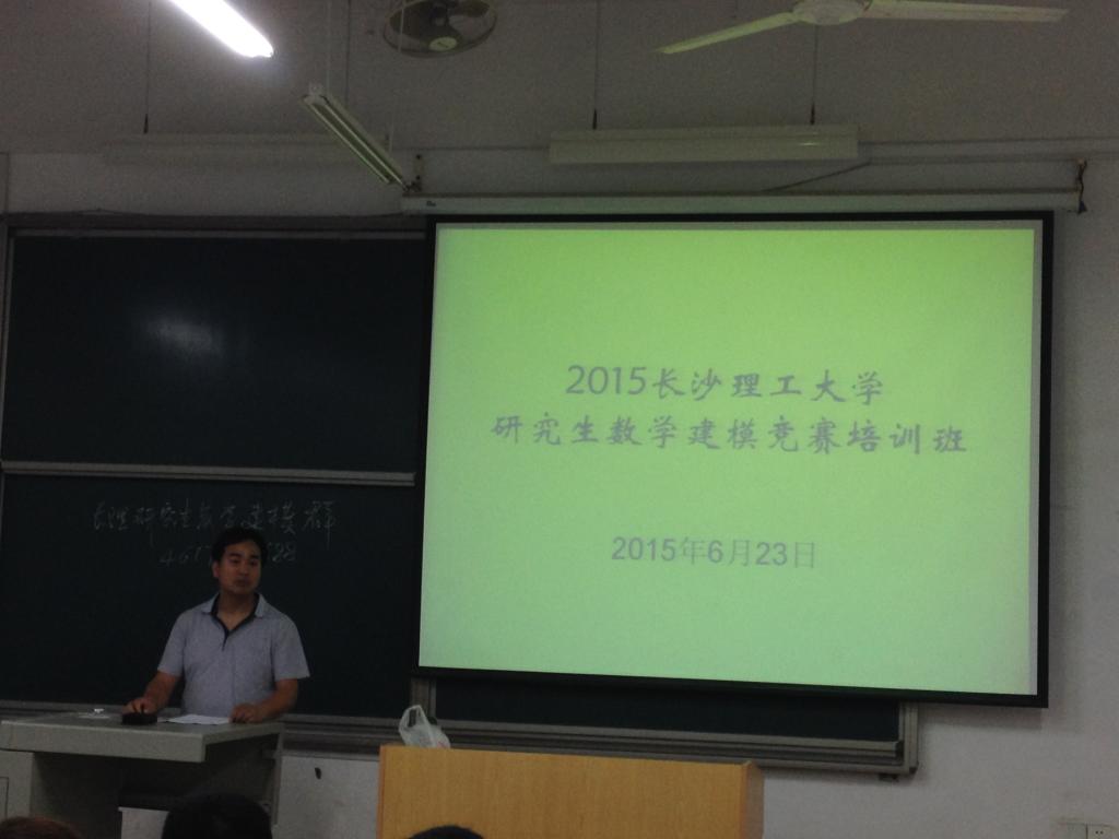 为培养研究生应用数学知识解决相关专业问题的能力,也为迎接即将举行的湖南省首届研究生数学建模竞赛和全国研究生数学建模竞赛集训队员,我校决定举办研究生数学建模竞赛培训班,并由数计学院承办。经过前期的有序准备,竞赛培训于2015年6月23日晚上6:30至9:30在云理科楼A-104正式开课。来自我校11个学院的105名同学报名参加培训,体现了我校研究生对数学建模竞赛的热爱。
