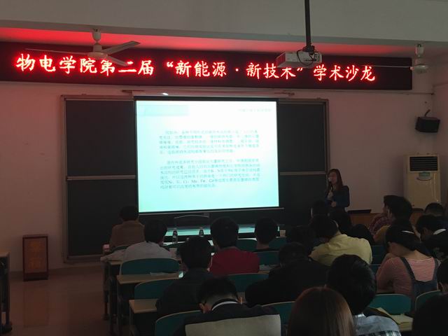 4月19日下午16:00在理科楼B513,物电学院成功举办第二届“新能源·新技术”学术沙龙之优秀研究生学术汇报活动。物电学院副院长丁开和副教授、张振华教授、白创博士、段军飞博士担任点评嘉宾,研究生辅导员郑忠辉老师和全体研究生到场参加活动。14级电子科学与技术专业研究生王磊、14级凝聚态物理专业研究生刘娟和14级材料学专业研究生郑健三位同学作学术汇报,活动由15级研究生严小艳主持。