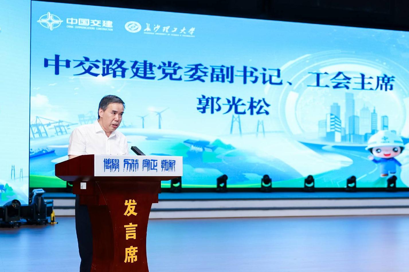 中交路建党委副书记、工会主席郭光松代表中交集团致辞,高度认可我校的办学特色和人才培养质量,希望双方加强紧密合作,共同投身国家重大工程建设。张泽世代表集团作招聘宣讲,从“有为、敢为、可为”三方面介绍了集团百年发展历程、践行“创新、绿色、数智、融合、可持续”五大核心发展理念和坚持“人才强企”的战略布局。