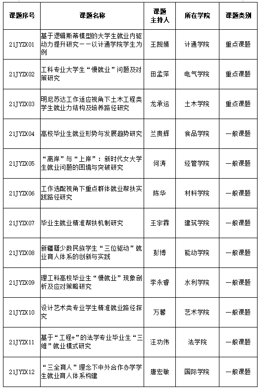 根据《关于开展2021年2025年新澳门原料网站毕业生就业专项课题研究申报工作的通知》要求,经个人申报、学院推荐、学校组织专家评审, 现对12项就业专项课题予以立项,其中3项重点专项课题,9项一般课题。具体名单如下: